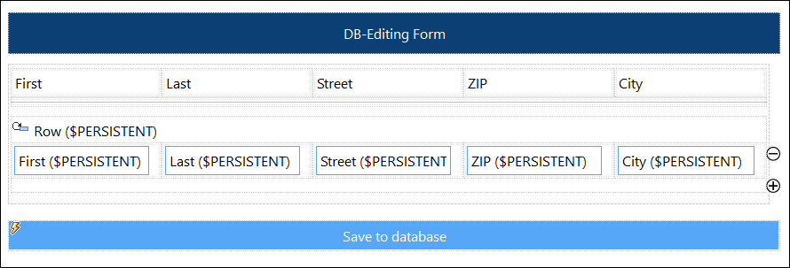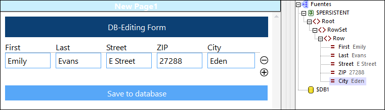 4.Copie todos los nodos de los registros de $DB1 a $PERSISTENT con la acción Actualizar nodo(s). Una vez los datos se han anexado a la estructura $PERSISTENT, esta aparecerá automáticamente en la tabla. Esto se debe a que los controles de las celdas de la tabla contienen enlaces de fuente de página a los nodos de la fuente de página $PERSISTENT.