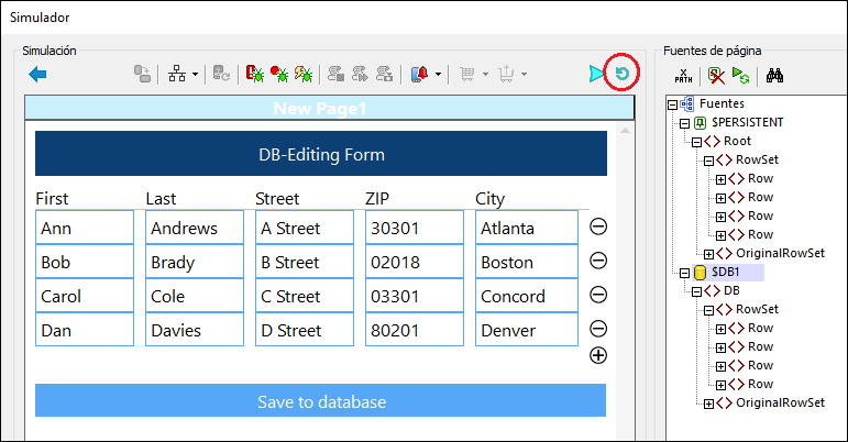 •Al hacer clic en Actualizar (dentro de un círculo rojo en la imagen siguiente) se descargan todas las filas con datos del servidor a $DB1 y de ahí se copian a $PERSISTENT (consulte las acciones del evento OnPageRefresh tal y como se definió en la pestaña de este evento). Cualquier información que estuviera previamente en $PERSISTENT antes de actualizar se borra. Las filas de $PERSISTENT aparecen en la tabla, por lo que en la tabla ahora se ven todos los registros del servidor. Observe que la configuración del acceso al servidor de $DB1 es A petición. Esto garantiza que solamente se contacte con el servidor cuando se hace una petición al servidor, como cuando se vuelven a cargar los datos de la BD. Y esto significa que los usuarios pueden trabajar sin conexión hasta que necesiten cargar datos en el servidor.