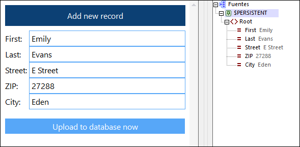La solución permite introducir los registros en un dispositivo cliente uno a uno de forma que se vayan guardando en una base de datos SQLite en el servidor, Addresses.sqlite, antes de que se introduzca el siguiente. Durante el proceso de edición, el registro se almacena en la fuente de página $PERSISTENT en el cliente (imagen siguiente). El acceso al servidor de la solución se restringe con la opción Bajo demanda, que configura la aplicación para que solo se comunique con el servidor cuando es necesario y se ha indicado de forma explícita en el flujo de trabajo de la solución. Hasta ese momento, la solución permanece sin conexión y la información del registro se introduce también mientras la solución está sin conexión. Cuando un usuario hace clic en Cargar en la BD ahora, la solución del cliente se conecta con el servidor para cargar el registro en la base de datos SQLite en el servidor.