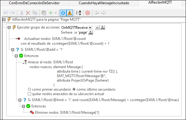 Tenga en cuenta que la información que esté en el mensaje pasará automáticamente a la fuente de página $MT_MQTT. Esta información contiene dos elementos de datos: (I) el mensaje MQTT, que se almacenará como cadena de texto, (ii) el nombre del tema bajo el cual el mensaje se ha enviado. Ahora podría, por ejemplo, añadir el nuevo mensaje a un archivo XML que contenga todos los mensajes recibidos para los temas de esa página. La imagen siguiente muestra una secuencia de acciones que hace esto, añadiendo un nuevo nodo Mensaje a la fuente de página $XML1 y eliminando cualquier mensaje anterior en caso de que se haya establecido un límite de un solo mensaje para la fuente de página $XML1.