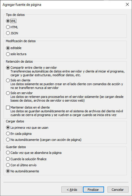 Esta opción se habilita si la fuente de página es un archivo externo (XML, HTML o BD). Determina si los datos se guardan (i) cada vez que se abandona la página, (ii) cuando la solución finalice, (iii) cuando el usuario haga clic en la opción Con el último envío o (iv) cuando una acción de página o de control lo indique de forma expresa (consulte Acciones de las fuentes de página).