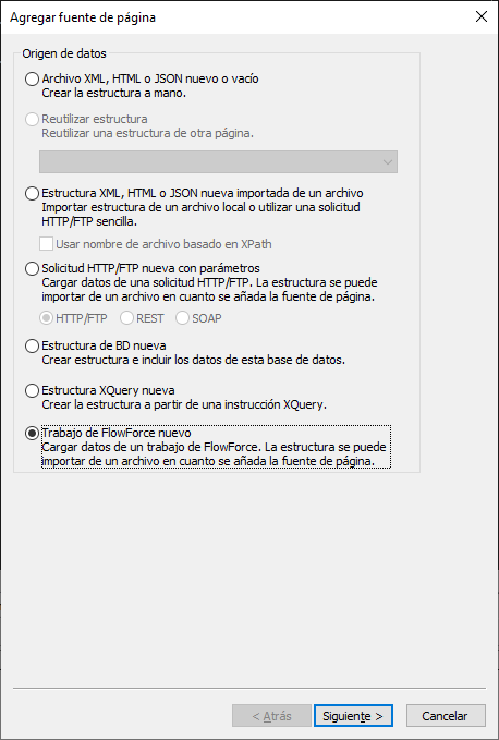 Puede añadir una fuente de página que reciba datos de un trabajo de Altova FlowForce y tome su estructura de un archivo o de una estructura que haya creado manualmente en el panel Fuentes de página. Para crear esta fuente de página siga estos pasos: en la primera pantalla del cuadro de diálogo "Agregar fuente de página" (imagen siguiente) seleccione Trabajo de FlowForce nuevo.