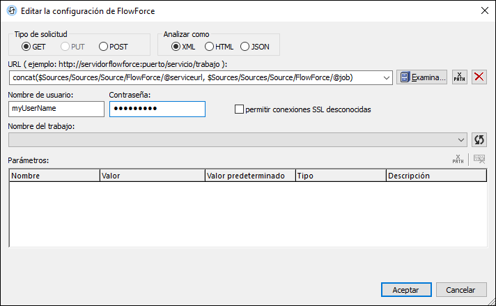 Haga clic en Finalizar para abrir el cuadro de diálogo "Editar la configuración de FlowForce" (imagen siguiente). Introduzca los datos para acceder a un servidor y servicio de FLowForce. Si introduce una URL y después hace clic en el botón Actualizar de la entrada del nombre del trabajo se creará una conexión al servidor FlowForce y aparecerán los trabajos disponibles. Si selecciona un trabajo puede ver sus parámetros e introducir los valores de parámetro que necesite. Si quiere componer la URL de FlowForce Server con una expresión XPath debe indicar el nombre del trabajo en la URL y, en el panel Parámetros, introducir los parámetros y sus valores manualmente.