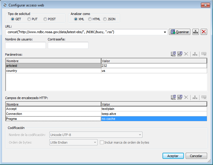La configuración de las solicitudes HTTP/FTP se define en el cuadro de diálogo "Configurar acceso web" (imagen siguiente). Introduzca el tipo de solicitud, la URL del recurso de destino, el formato de datos del recurso de destino (XML, HTML o JSON), la información de autenticación del usuario y, si es necesario, los parámetros y encabezados de la consulta. En la imagen siguiente, por ejemplo, puede ver que la solicitud GET se compuso con ayuda de una expresión XPath que apunta a una página .rss del sitio web http://www.ndbc.noaa.gov. El nombre de la página RSS se toma del nodo /NDBC/buoy y la página de destino se analizará como XML. Pueden añadirse parámetros y encabezados de consulta a la solicitud. Sin embargo, el encabezado charset se genera automáticamente desde MobileTogether Designer y no será reemplazado por el encabezado charset que se introduce en este cuadro de diálogo.