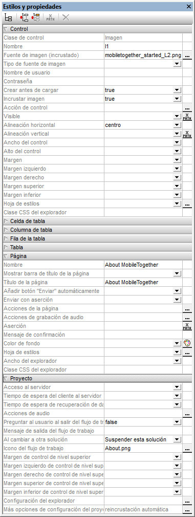 La característica Hojas de estilos de MobileTogether permite usar una o más hojas de estilos para definir las propiedades de estilos de las páginas de un proyecto. En la hoja de estilos Proyecto puede definir un estilo por cada tipo de control (por ejemplo, para todos los botones) para todas las tablas y todas las páginas de ese proyecto. Esto quiere decir que puede definir estilos predeterminados para todo el proyecto y después sobrescribirlos en algunas instancias. Así funcionan los estilos en cascada: