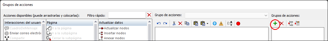 3.En el cuadro de diálogo Grupos de acciones que aparece (imagen siguiente) haga clic en el botón Agregar un grupo del panel Grupos de acciones (dentro de un círculo rojo en la imagen siguiente).