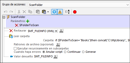 •La biblioteca de acciones de servidor contiene un grupo de acciones, ScanFolder, cuya definición puede verse en la imagen anterior.