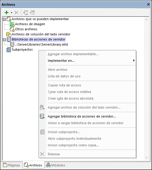 1.En el panel Archivos haga clic con el botón derecho del ratón en el elemento Bibliotecas de acciones de servidor para acceder al menú contextual correspondiente y seleccione Agregar biblioteca de acciones de servidor (imagen siguiente). También puede usar el comando de menú Reestructurar | Agregar biblioteca de acciones de servidor.