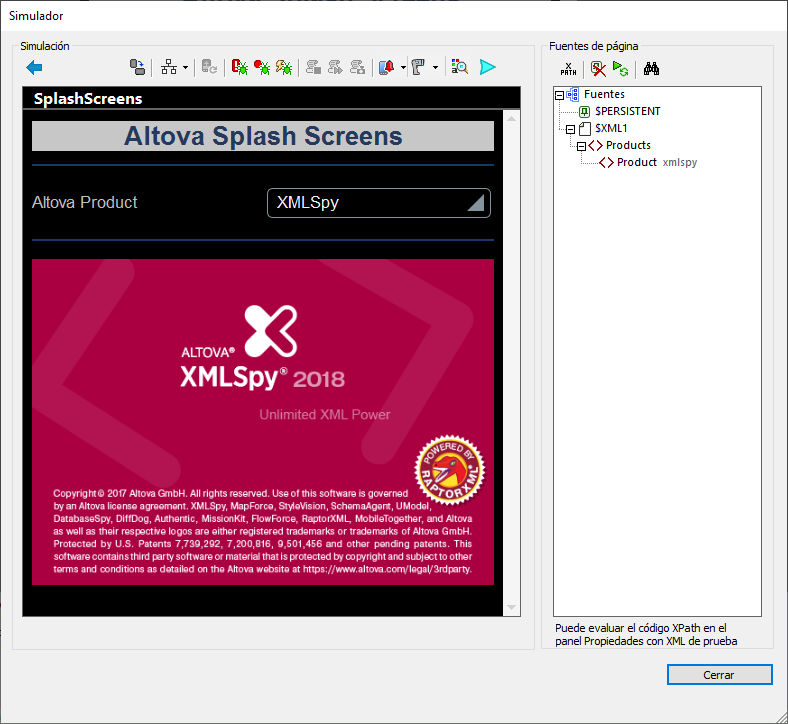 •Evaluar XPath: Abre la ventana XPath/XQuery, donde puede evaluar las expresiones XPath. Las expresiones XPath también se pueden evaluar en el panel Estilos y propiedades mientras se ejecuta la simulación.