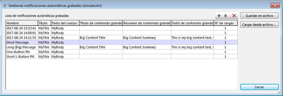 En el cuadro de diálogo "Gestionar notificaciones automáticas grabadas (simulación)" (imagen anterior), cada NA grabada aparece en una línea distinta y se enumera con su nombre, sus datos de mensaje largo y su información de carga. Para cambiar el orden de las NA en este cuadro de diálogo seleccione una NA y luego haga clic en el icono Subir o Bajar de la barra de herramientas (imagen anterior). Para eliminar NA de la lista seleccione una NA y haga clic en el icono Eliminar de la barra de herramientas. También puede editar el nombre de las NA (haciendo doble clic en el nombre y editándolo). Los cambios que se realizan en este cuadro de diálogo se guardan en memoria. Recuerde que para guardar los cambios en el archivo MTD debe hacer clic en Guardar en archivo.