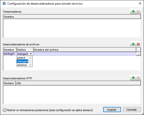 2.Este cuadro de diálogo contiene un panel para cada tipo de desencadenador. (La imagen siguiente muestra el panel para desencadenadores de archivos) Añada una entrada para cada uno de los desencadenadores que quiera simular haciendo clic en el icono Agregar. Si no añade ninguna entrada, los nodos de la fuente de página $MT_SERVICE estarán vacíos durante la simulación. Si en la definición de las acciones del servicio no hay ninguna expresión XPath que acceda a un nodo de la fuente de página, resulta irrelevante si la estructura $MT_SERVICE contiene datos o no.