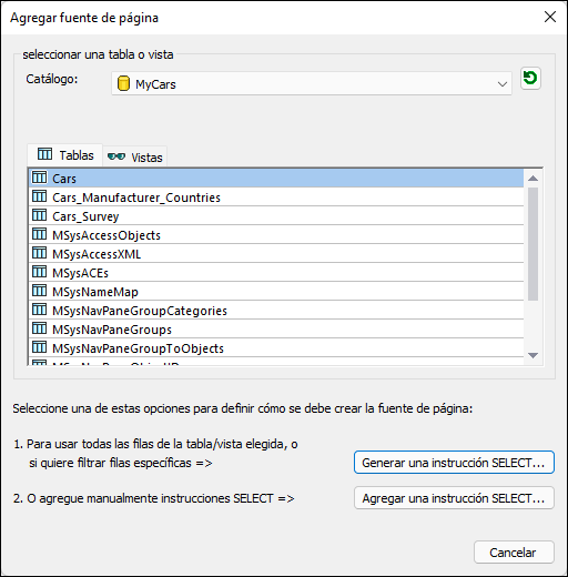 La tabla Cars se crea como fuente de página de la página del diseño y aparece en el cuadro de diálogo Fuentes de página (imagen siguiente).