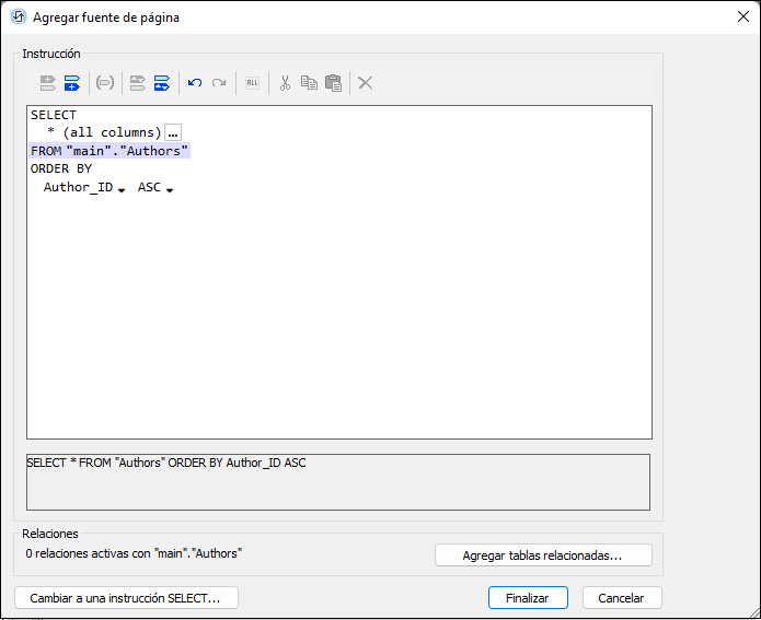 3.En el cuadro de diálogo siguiente (imagen siguiente izquierda), anexe una instrucción Ordenar por y ordene los registros de autor por AuthorName y después haga clic en el botón Agregar tablas relacionadas.