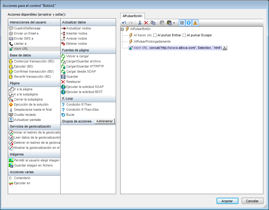 5.Haga clic sobre el botón XPath y una vez en el cuadro de diálogo "Editar expresión XPath/XQuery" que aparece, introduzca la siguiente expresión XPath: concat('https://www.altova.com/', Selection, '.html')