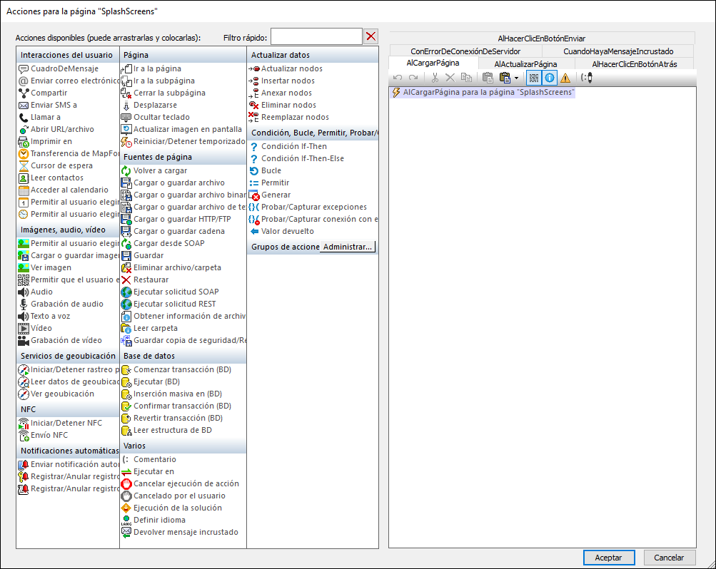 3.Arrastre la acción Cargar o guardar archivo hasta la pestaña del evento AlCargarPágina.