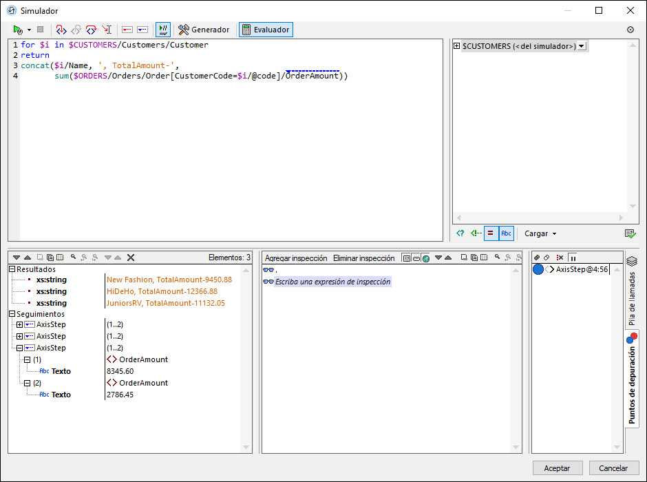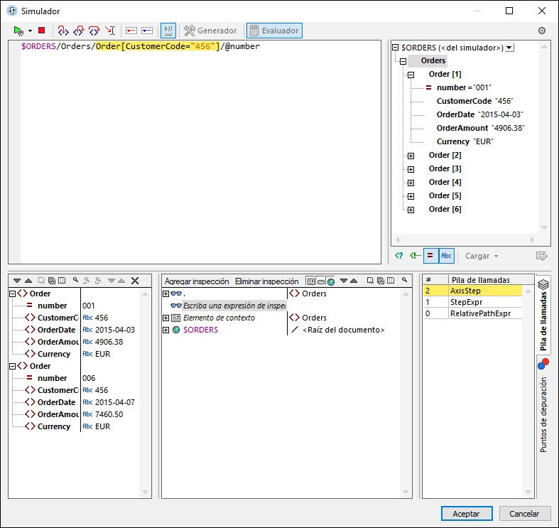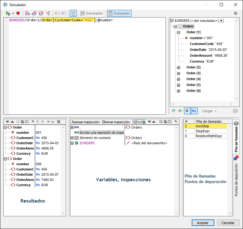 •acceder al proceso de evaluación XPath paso por paso para ver cómo se va evaluando la expresión XPath. Puede usar el botón Paso a paso por instrucciones (F11) para ello. En cada paso de la evaluación se resalta en amarillo la parte de la expresión que se está evaluando (imagen anterior) y el resultado de la evaluación de ese paso aparece en el panel Resultados. Por ejemplo, en la imagen anterior se han seleccionado todos los elementos Order que tienen un elemento secundario llamado CustomerCode que contenga el valor '456'.