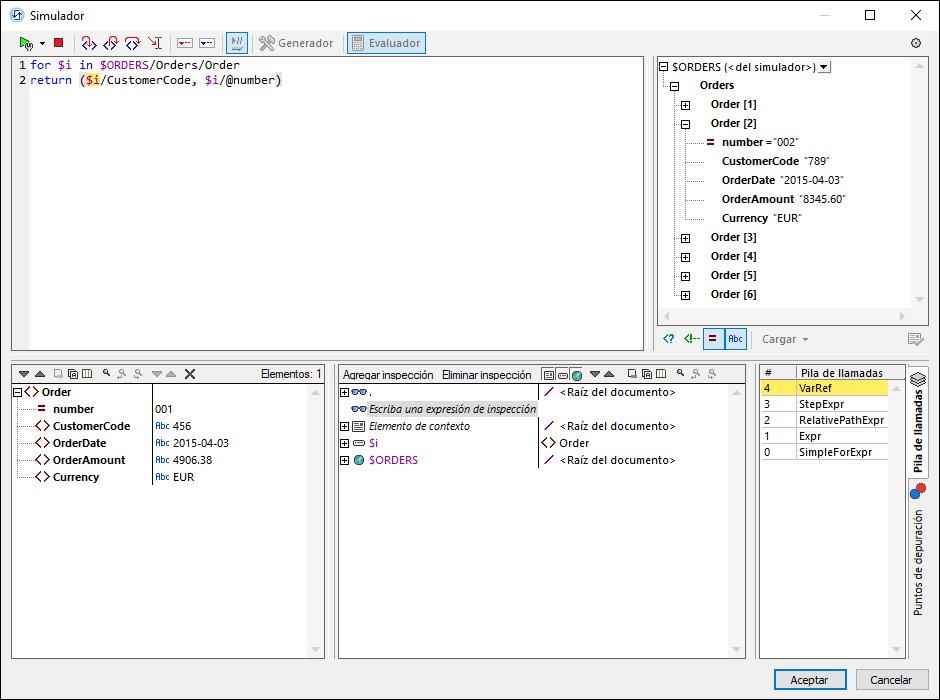 •generar datos adicionales. Por ejemplo, en la imagen anterior hemos introducido la expresión de inspección count(//Order) para contar todos los elementos Order.