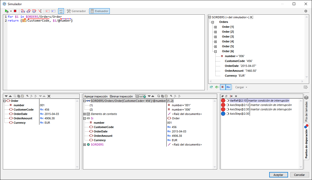 •Puede definir los puntos de interrupción para que dependan de algún factor introduciendo una condición de interrupción. Vaya al panel Puntos de depuración, (i) haga doble clic en el punto de interrupción Insertar condición de interrupción, (ii) introduzca la expresión para la condición y (iii) pulse la tecla Entrar. Ese punto de interrupción se habilita solamente si la condición evalúa en true. Por ejemplo, en la imagen anterior la condición de interrupción $i/CustomerCode="456" habilita el punto de interrupción en $i (es decir, el elemento Order actual) cuando el elemento secundario CustomerCode del elemento Order tiene el valor "456". Así, el procesamiento pausa en cada pedido del cliente que tenga el código de cliente 456. La imagen muestra la evaluación detenida en el sexto pedido, que se corresponde con el criterio que acabamos de explicar. El punto de interrupción no se activa con clientes que tengan otros códigos.
