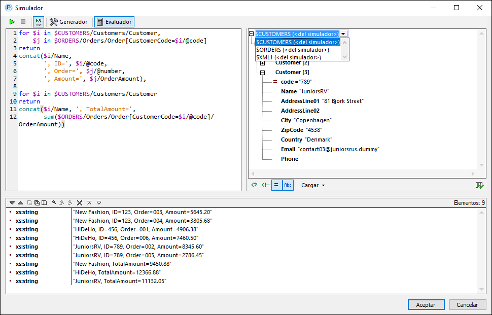 •Si abre la ventana XPath/XQuery desde la ventana Simulador, entonces las fuentes de datos del diseño ya estarán cargadas para la simulación, por lo que la evaluación se puede llevar a cabo directamente en esas fuentes de datos. Puede ver las estructuras (árboles de esquema) de estas fuentes de datos en el panel Árbol de esquema tanto del Evaluador como del Generador. En el modo evaluador no se puede ver más de un árbol de esquema al mismo tiempo (imagen anterior). Para cambiar a otro árbol en el panel Árbol de esquema del modo evaluador seleccione otro árbol en el menú desplegable del selector del árbol de esquema (imagen anterior).