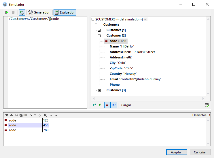 El Evaluador de expresiones (imagen siguiente) permite aplicar una expresión XPath/XQuery a un archivo de fuente de datos y previsualizar el valor de retorno. En el modo evaluador la ventana tiene tres paneles: