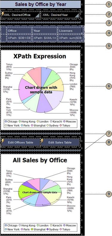 Todos los componentes son los controles que se han arrastrado desde el Panel de control hasta el diseño. A cada uno de ellos se la ha asignado propiedades en el Panel "Propiedades & estilos". Para los controles que necesitan asociarse con datos de la fuente de página, el nodo de origen apropiado ha sido asignado mediante el arrastre del nodo de fuente de página hasta el control. Además, los cuadros combinados y los botones presentan acciones asociadas a sus eventos. Estas acciones se asignan en el cuadro de diálogo "Acciones" al control. A éste se accede haciendo clic con el botón derecho sobre el control y seleccionando el comando "Acciones de control para..."