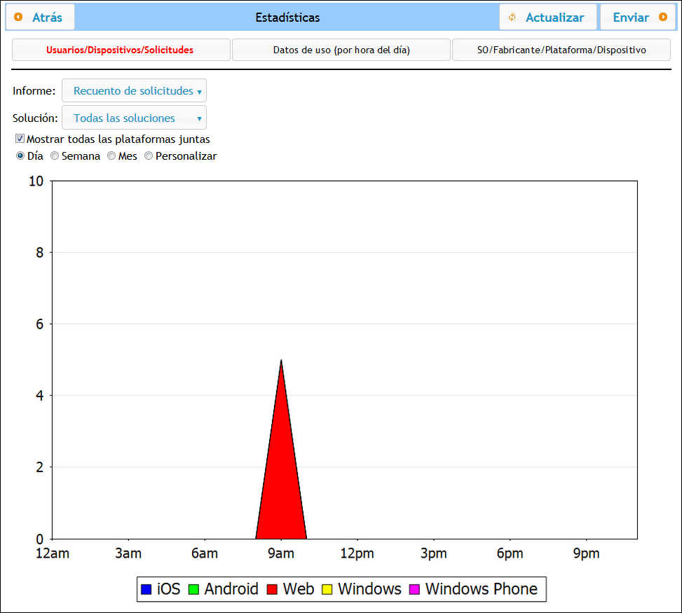 Cada pestaña cuenta con un filtro llamado Solución y con uno o dos filtros más. El filtro Solución permite seleccionar una sola solución de las que están implementadas en el servidor. También puede seleccionar todas las soluciones. Los otros filtros sirven para seleccionar la categoría de estadísticas que se desea consultar. Y también puede seleccionar un período de tiempo concreto.