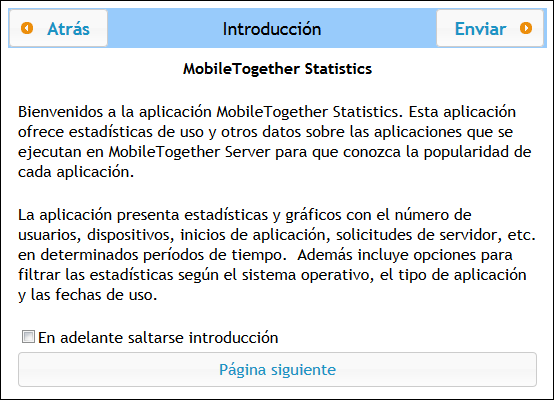 A partir de la versión 4.0 de MobileTogether Server la solución Statistics viene implementada en MobileTogether Server por defecto y se encuentra en el contenedor /admin. La solución Statistics se actualiza regularmente para ofrecer informes mejorados. Recomendamos que actualice su solución Statistics a su última versión para poder disponer de todas sus funciones.