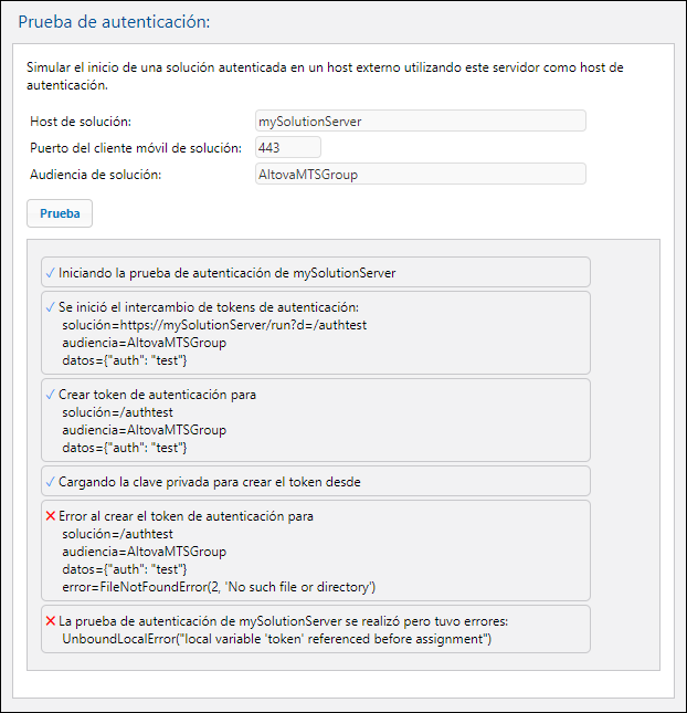 La configuración de prueba de la autenticación permite definir las propiedades del servidor remoto en el que quiere probar la comunicación autenticada. El servidor actual hace de servidor de autenticación y la comunicación entre este y el servidor remoto simula la comunicación autenticada. Una vez haya introducido las propiedades del servidor remoto haga clic en Prueba (imagen siguiente). Durante la comunicación, los mensajes de registro de los dos servidores aparecen en el panel de mensajes que hay bajo el botón Prueba (imagen siguiente). Ahora puede examinarlos para depurar cualquier problema de comunicación o autenticación.