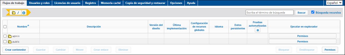 •La pestaña Flujos de trabajo contiene por defecto el contenedor raíz. Los contenedores se indican con el carácter "/".