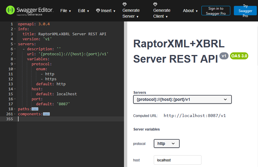 Puede interactuar con la API HTTP de Raptor abriendo el archivo de documento OpenAPI de muestra (ver más arriba) en el editor Swagger (imagen siguiente) y enviando solicitudes a la API HTTP. El panel izquierdo del editor muestra el código YAML del archivo de descripción y el panel derecho muestra la interfaz interactiva generada por el editor Swagger. Al editar el código en el panel izquierdo, los cambios se muestran directamente en el panel derecho. La interfaz interactiva le permite introducir los detalles de las solicitudes HTTP, ejecutar estas solicitudes y ver las respuestas del servidor. El mecanismo para enviar solicitudes a la API HTTP de RaptorXML+XBRL Server y recibir respuestas se describe en la sección Solicitudes cliente.