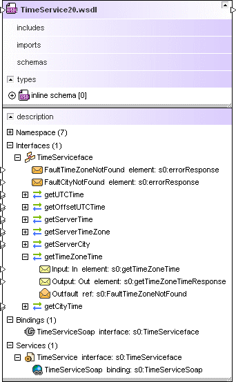 2.Expanda las secciones del recuadro WSDL para ver información sobre sus archivos WSDL o esquemas importados, sus esquemas alineados, sus definiciones de servicio web (WSDL 1.1) o sus descripciones de servicio web (WSDL 2.0).
