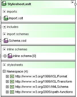 Una vez expandidos, los recuadros de archivos XSLT incluyen cinco secciones para archivos XSLT importados e incluidos, esquemas incluidos, esquemas alineados y hojas de estilos.