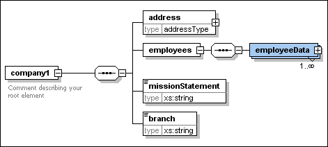 3.En la vista Esquema de XMLSpy haga clic en el icono Mostrar diagrama ic_component del elemento raíz company1 para ver su modelo de contenido.