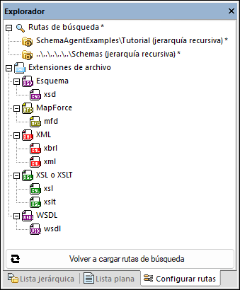 El comando Volver a cargar rutas de búsqueda actualiza las rutas de búsqueda. Esto es muy útil si se modificaron archivos fuera de SchemaAgent (en XMLSpy, por ejemplo) o si cambió la configuración de la ruta de búsqueda. Después de añadir, editar o eliminar una extensión de archivo o ruta de búsqueda, junto a ella aparece un asterisco y el botón Volver a cargar rutas de búsqueda aparece en la parte inferior de la pestaña Configurar rutas. Esto indica que las rutas de búsqueda que están cargadas en ese momento deben actualizarse.