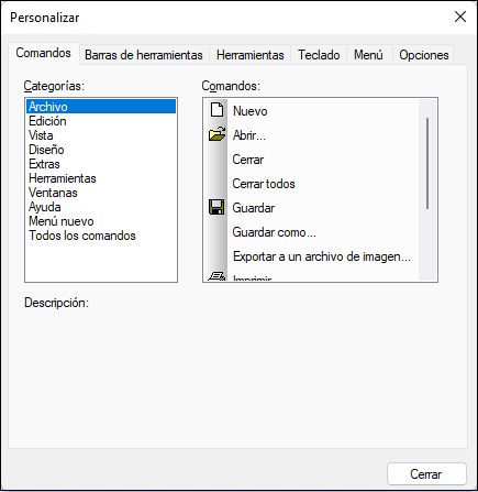 En la pestaña Comandos puede personalizar sus menús y barras de herramientas y añadir comandos a los menús y a las barras de herramientas, dependiendo de lo que necesite. No obstante, tenga en cuenta que no puede crear comandos ni menús nuevos para la aplicación.