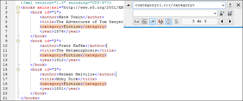 3.En el campo Buscar introduzca este texto: <category>(.+)</category>. Esta expresión regular encuentra todos los elementos category, que aparecerán resaltados.