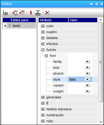 Para aplicar formato al texto estático, seleccione el texto y defina propiedades de estilo local. Por ejemplo, seleccione la cadena de texto "Source:" que acaba de insertar. Observe que en la ventana Estilos (imagen siguiente) está seleccionado el componente 1 texto. Expanda el grupo de propiedades fuente, seleccione la propiedad font | style y después elija el valor italic de la lista desplegable.