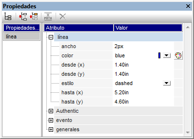 Para seleccionar una línea, haga clic en cualquier parte de ella (el cursor se convierte en una doble flecha cruzada cuando está encima de la línea). Una vez seleccionada, sus propiedades aparecen en la ventana Propiedades, donde se pueden editar (imagen siguiente).