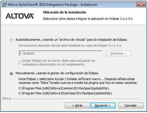 Recomendamos que elija la opción Automáticamente para que el asistente para la instalación se encargue de integrar el complemento. Seleccione la opción Automáticamente y después busque la carpeta donde se encuentra el ejecutable de Eclipse (eclipse.exe). Después haga clic en Siguiente. Si prefiere integrar el complemento de StyleVision para Eclipse de forma manual, seleccione la opción De forma manual (imagen siguiente). Más abajo explicamos cómo se integra el complemento de forma manual.