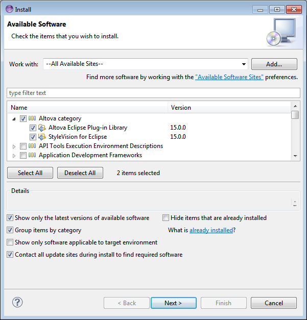 6.En el cuadro combinado Work With (Trabajar con) del cuadro de diálogo "Install" seleccione la opción All Available Sites (Todos los sitios disponibles, imagen siguiente). Como resultado aparecen todos los complementos disponibles en el panel inferior. Marque la casilla de nivel superior de la carpeta Altova category (imagen siguiente). Después haga clic en Next (Siguiente).