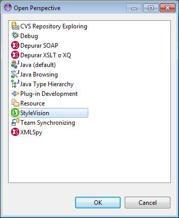 En Eclipse seleccione el comando Window | Perspective | Open Perspective | Other. En el diálogo que aparece (imagen siguiente) seleccione StyleVision y haga clic en OK o Open.