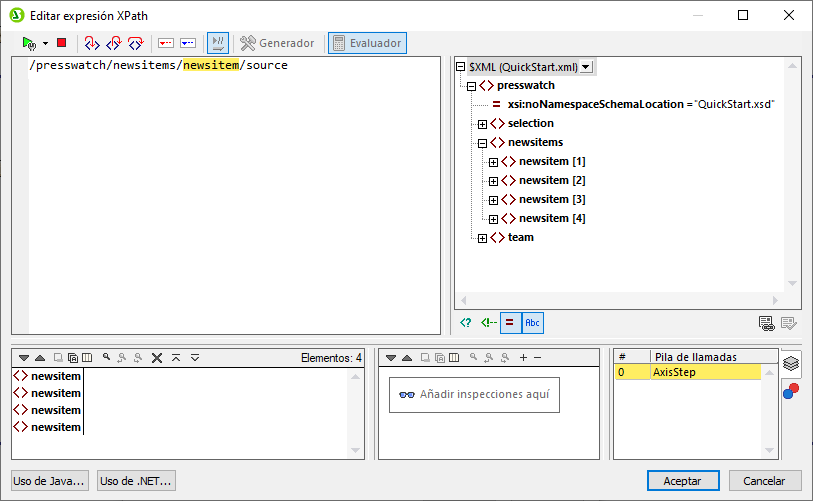 •acceder al proceso de evaluación XPath paso por paso para ver cómo se va evaluando la expresión XPath. Puede usar el botón Paso a paso por instrucciones (F11) para ello. En cada paso de la evaluación se resalta en amarillo la parte de la expresión que se está evaluando (imagen anterior) y el resultado de la evaluación de ese paso aparece en el panel Resultados. Por ejemplo, en la imagen anterior se han seleccionado todos los elementos section descendientes del elemento book.