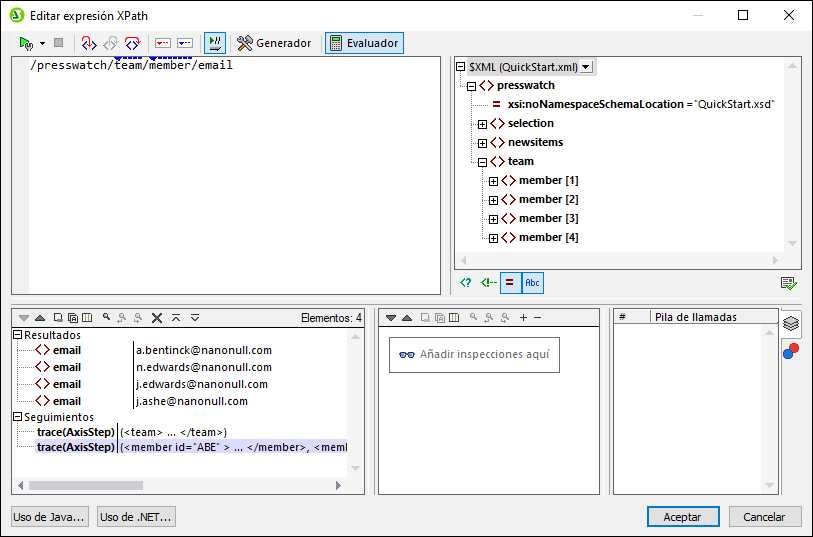 Los puntos de seguimiento son puntos en los que se graban los resultados. Estos resultados aparecen en la estructura Seguimientos de la pestaña Resultados (imagen siguiente). Esto permite ver todos los resultados de la evaluación en partes concretas de la expresión. Por ejemplo, en la imagen siguiente los puntos de seguimiento se pusieron en los nodos team y member; los resultados que corresponden a estos puntos de seguimiento aparecen en la estructura Seguimientos.