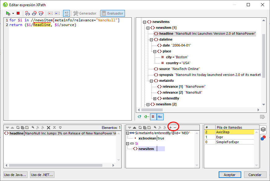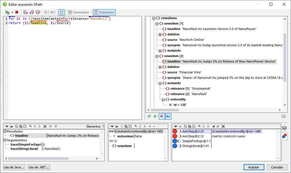 Las variables que se han declarado en la expresión y que están dentro del alcance del paso actual de la evaluación aparecen con sus valores actuales correspondientes. Por ejemplo, en la imagen anterior el procesamiento se ha pausado en el punto de interrupción que hay en el elemento headline. La variable $i está dentro del alcance en este paso de la evaluación, por lo que $i se muestra con su valor actual, que en la imagen anterior es el primer nodo newsitem.