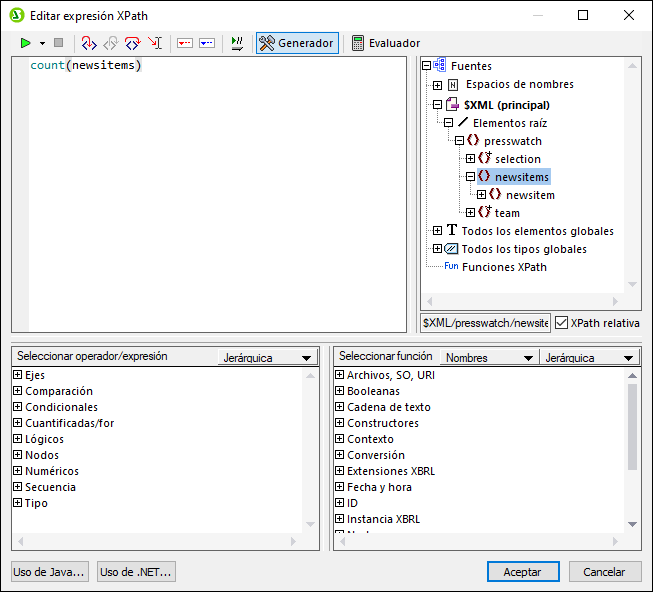 5.En el panel donde aparece el árbol del esquema observe que el nodo de contexto es newsitems, el cual aparece resaltado. Ahora escriba la expresión count(newsitem) en el recuadro superior del diálogo o genere la expresión usando los dos paneles de ayuda situados a la derecha. Por ejemplo, haga doble clic en la función count (situada en el grupo de funciones Secuencia) para insertarla en el recuadro superior. Después ponga el cursor dentro del paréntesis de la función y haga doble clic en el nodo newsitem del árbol del esquema. Para ver qué resultado devuelve la expresión, haga clic en el botón Evaluador. El resultado de la evaluación aparece en el panel Resultados, situado en la parte inferior derecha (imagen siguiente). Para más información sobre cómo usar este cuadro de diálogo, consulte el apartado Editar expresiones XPath.