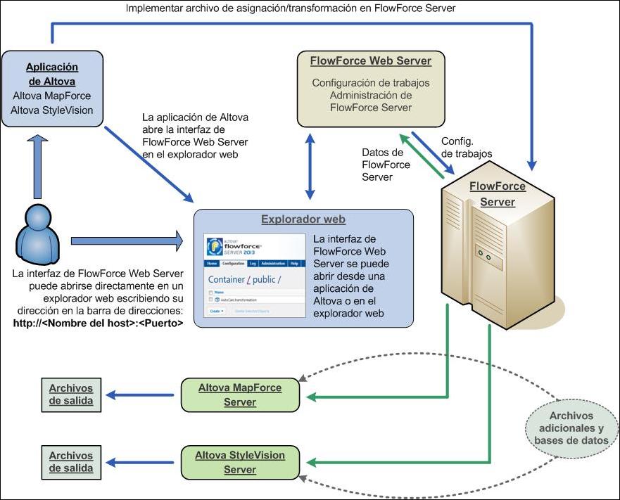 En el diagrama que aparece a continuación puede ver qué papel desempeña StyleVision Server en el flujo de trabajo de FlowForce Server. El diagrama también incluye MapForce Server porque también se pueden crear trabajos de FlowForce Server que envían asignaciones de Altova MapForce a Altova MapForce Server para que las ejecute.