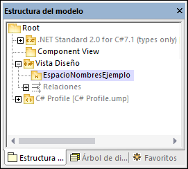 En este ejemplo el paquete Vista diseño actúa como contenedor de la parte del proyecto que corresponde al diseño (por ejemplo, clases y diagramas de clases), mientras que el paquete EspacioNombresEjemplo actúa como espacio de nombres para todas las clases que se van a crear. Sin embargo, la estructura de los paquetes en general no es prescriptiva y puede organizar los paquetes de otra manera si lo prefiere.