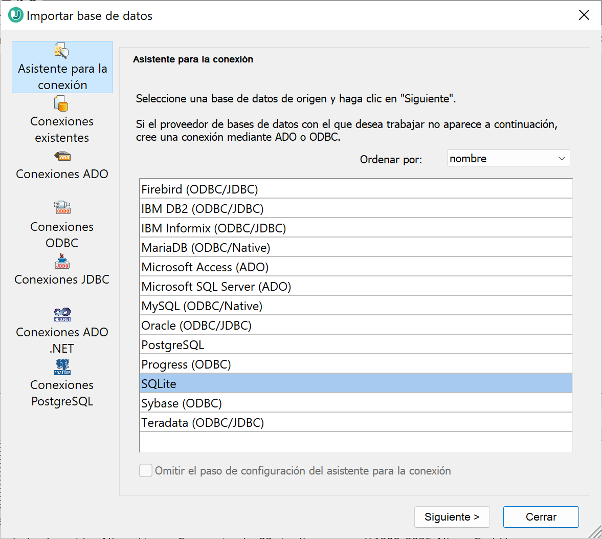 En el panel del asistente para la conexión (imagen siguiente) las bases de datos se pueden ordenar alfabéticamente por tipo de BD o por uso reciente. Seleccione la opción que prefiera en el cuadro combinado Ordenar. Una vez haya seleccionado el tipo de BD haga clic en Siguiente.