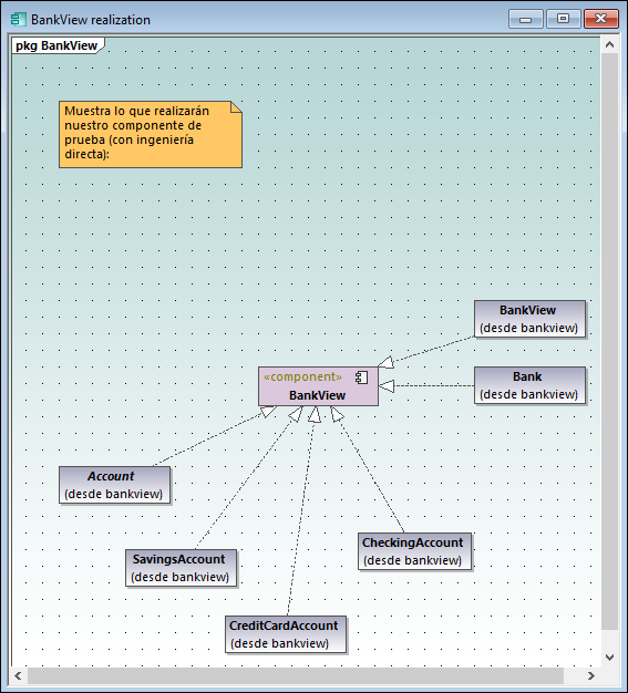 Al crear un nuevo diagrama o al abrir uno que ya existe, se carga una nueva ventana de diagramas en el panel Diagramas. La ventana de diagramas es la superficie en la que se pueden diseñar diagramas UML. Para acceder a los comandos de modelado disponibles haga clic con el botón derecho en la ventana de diagramas o en cualquier elemento que se encuentre en ella.