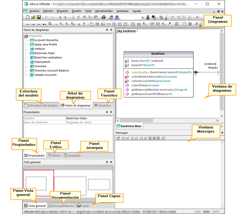 La interfaz gráfica del usuario de UModel consiste en un panel principal de diagramas y varias ventanas auxiliares más pequeñas en las que se puede introducir o visualizar información. El panel Diagramas contiene las ventanas de diagrama abiertas. Para recorrerlas use Ctrl+Tabulador.